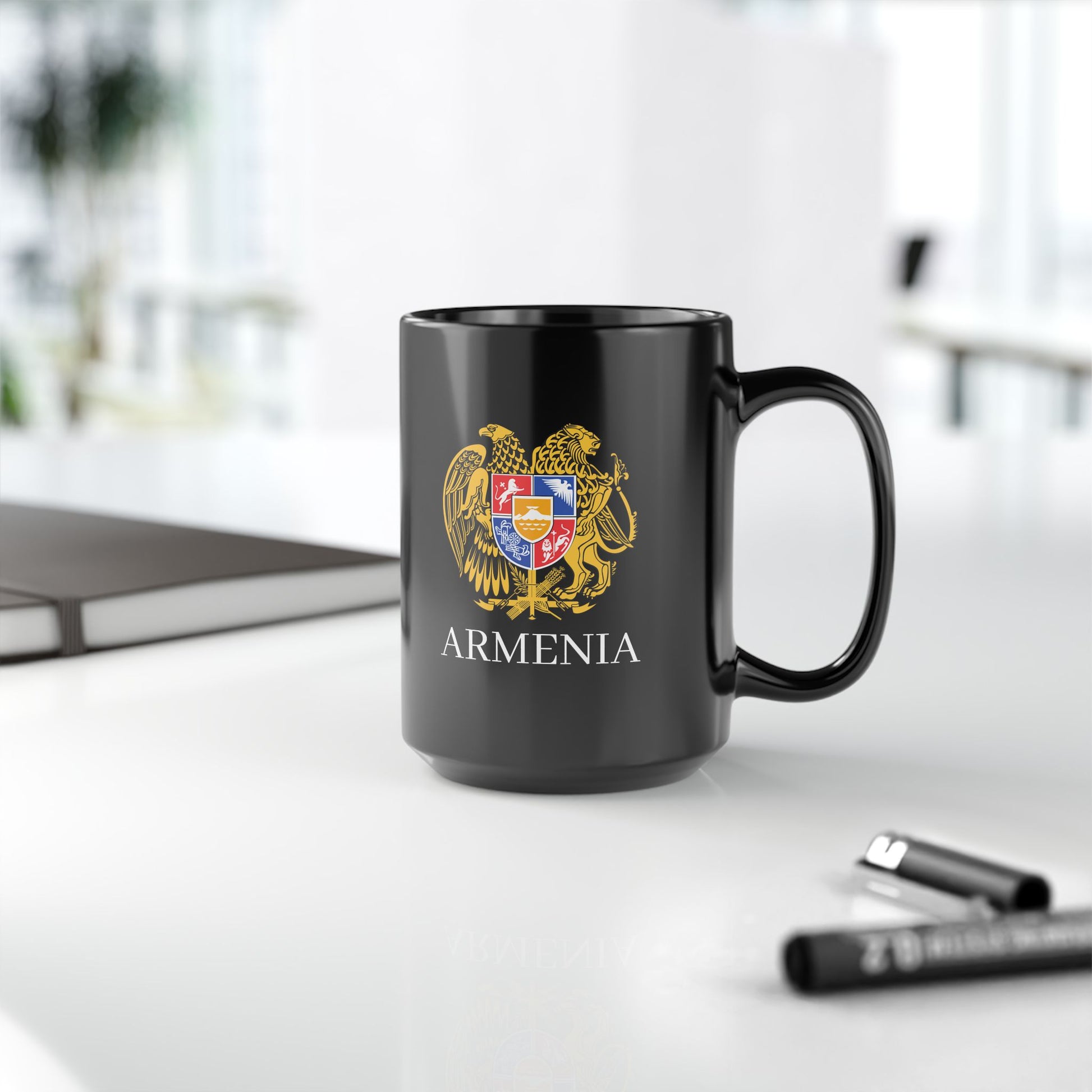 Add a touch of Armenian heritage to your morning coffee routine with this white Armenian Coat of Arms on a black mug. The vibrant colors of the coat of arms design stand out on the black ceramic mug, giving off a cozy and cultural vibe. Perfect for who appreciates Armenian culture and history. Ideal for celebrating Armenian holidays and heritage observances.