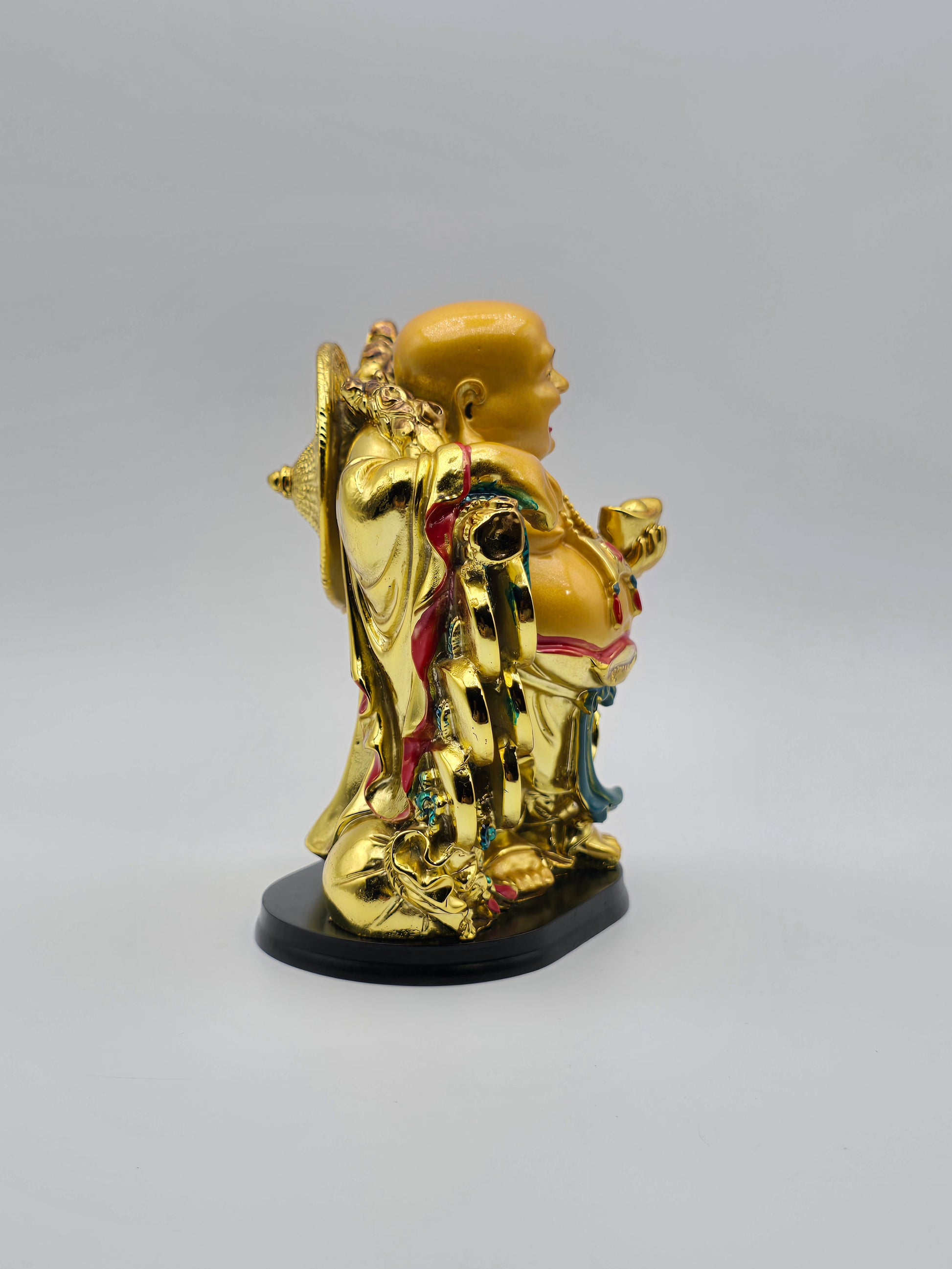 The product is a decorative statue of a Buddha figure holding an ingot, symbolizing happiness and wealth in Feng Shui practices. Standing at 5.4" tall and weighing 1.7 lbs. The statue reflects religious symbolism from Buddhism and is designed to bring positive energy to its surroundings. Perfect for collectors or those seeking spiritual decor for their homes, this piece embodies a sense of joy and prosperity.