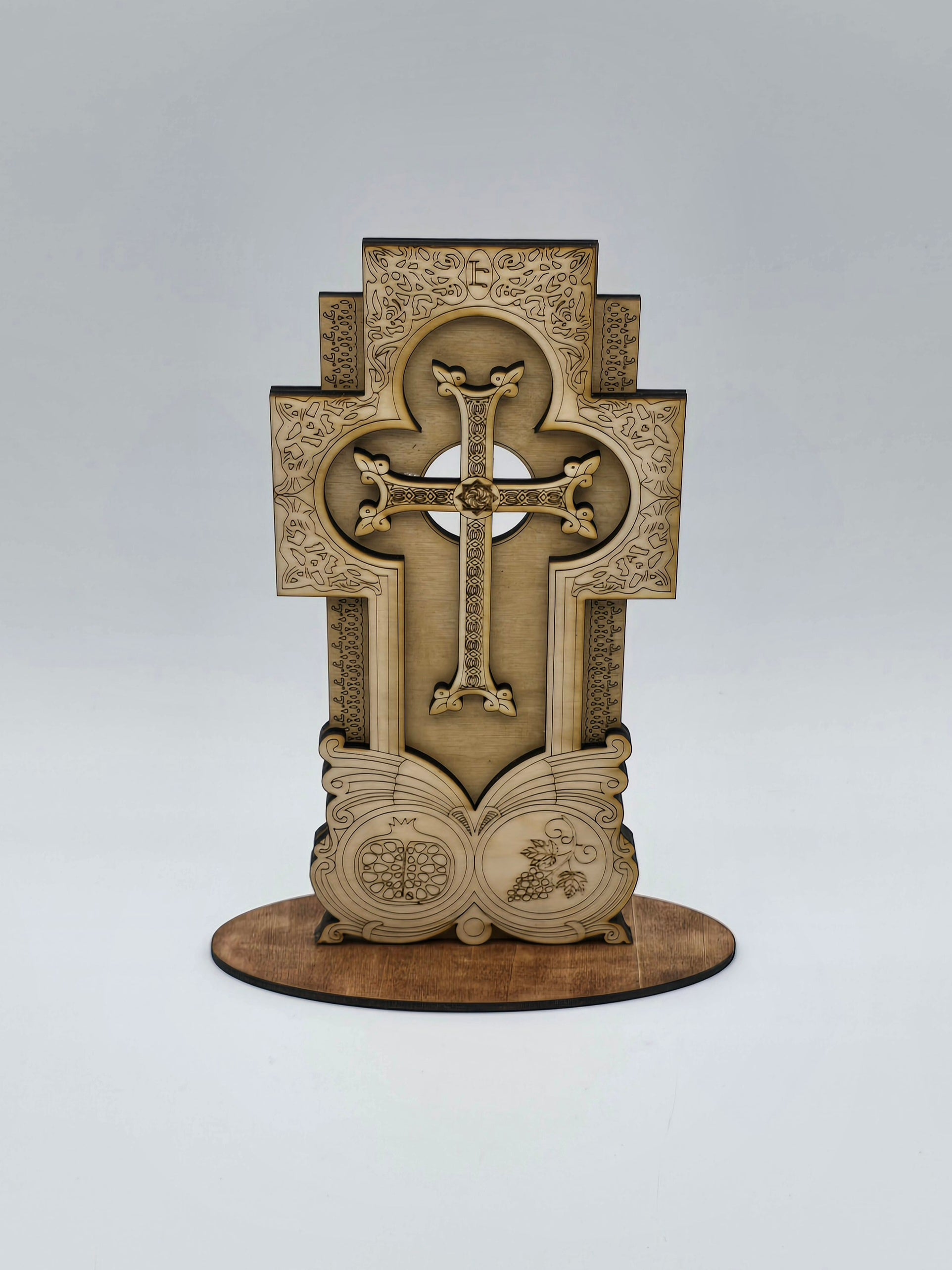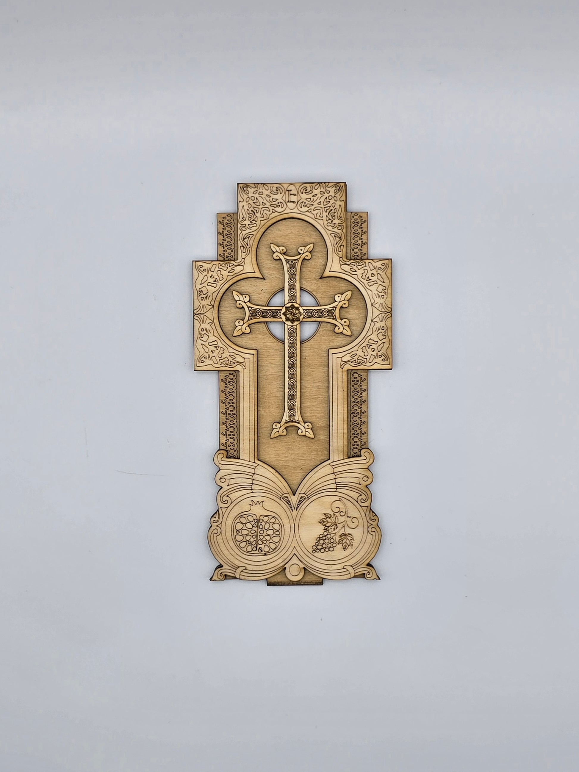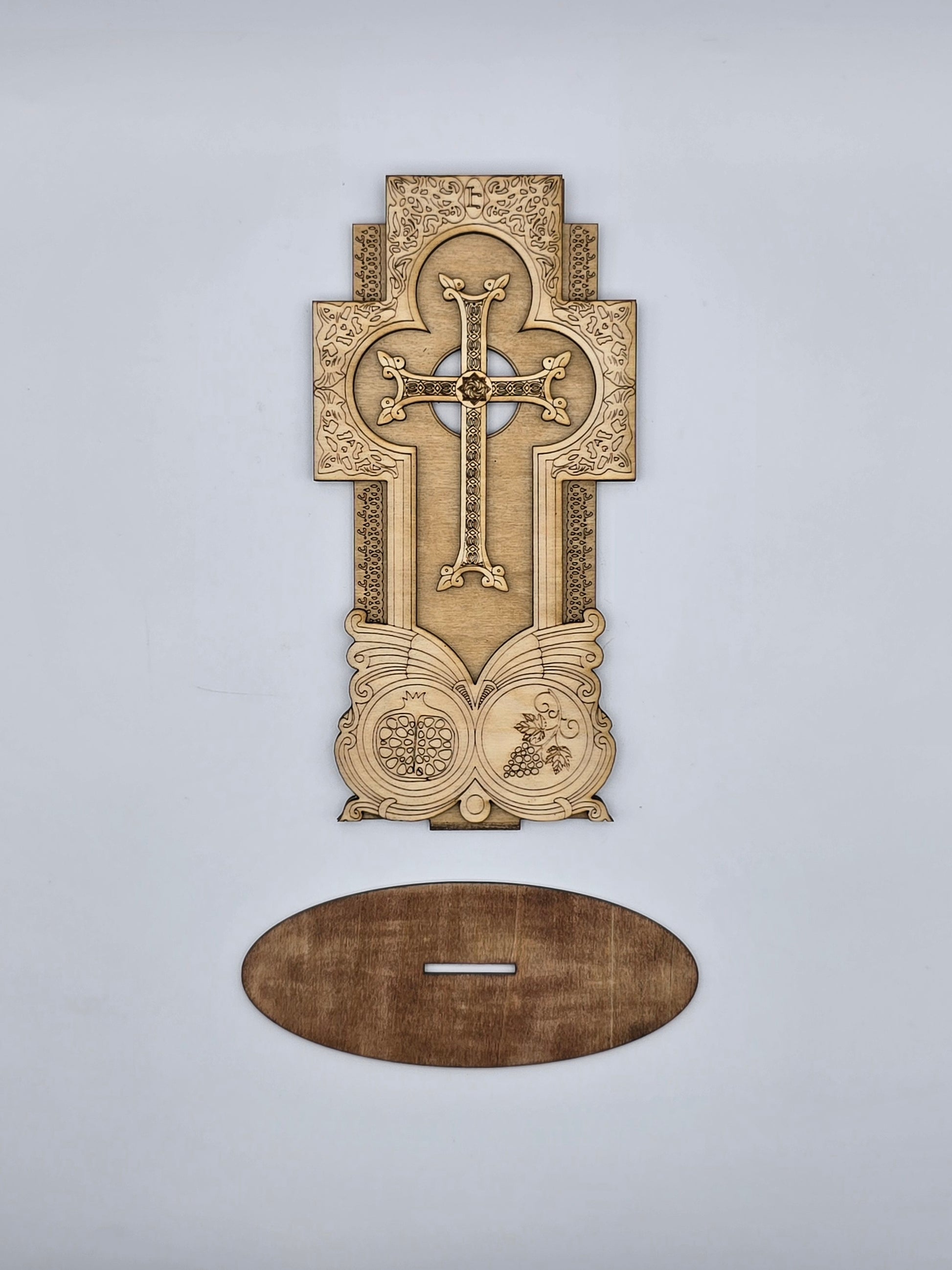 Handcrafted Armenian Wooden Khachkar Cross – Intricate Laser-Engraved Design