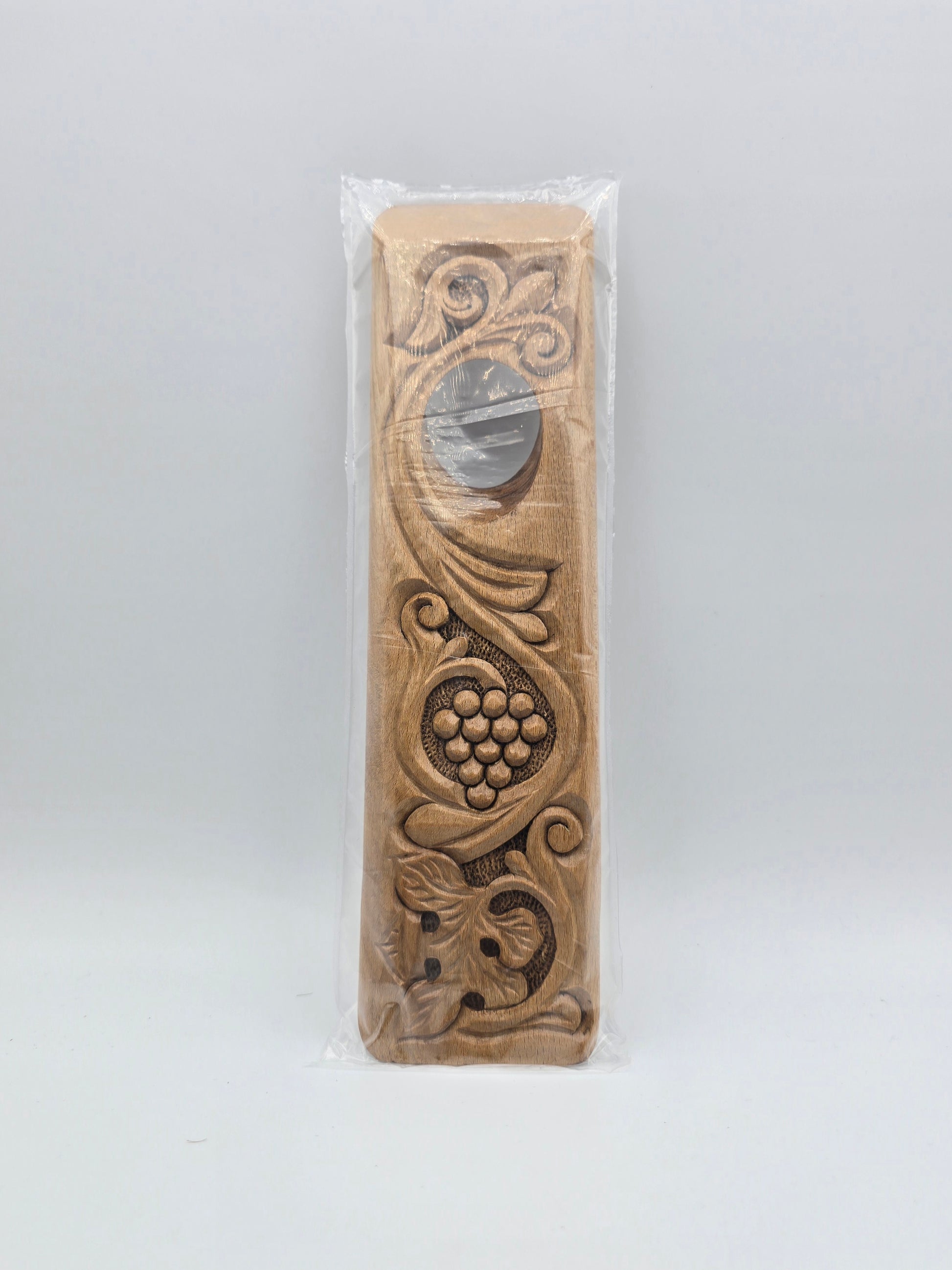 This is a beautifully crafted, handmade wooden wine bottle holder, measuring 10.75 inches in height and crafted from medium brown wood. It is a unique and elegant addition to any home bar or kitchen decor. Made in Armenia, this wine bottle holder showcases the intricate craftsmanship and rich medium brown color of the wood. With a weight of only 0.5 pounds, it is sturdy and durable for holding and displaying your favorite wine bottles. Perfect for wine enthusiasts or those looking to add a touch of rustic charm to their space.