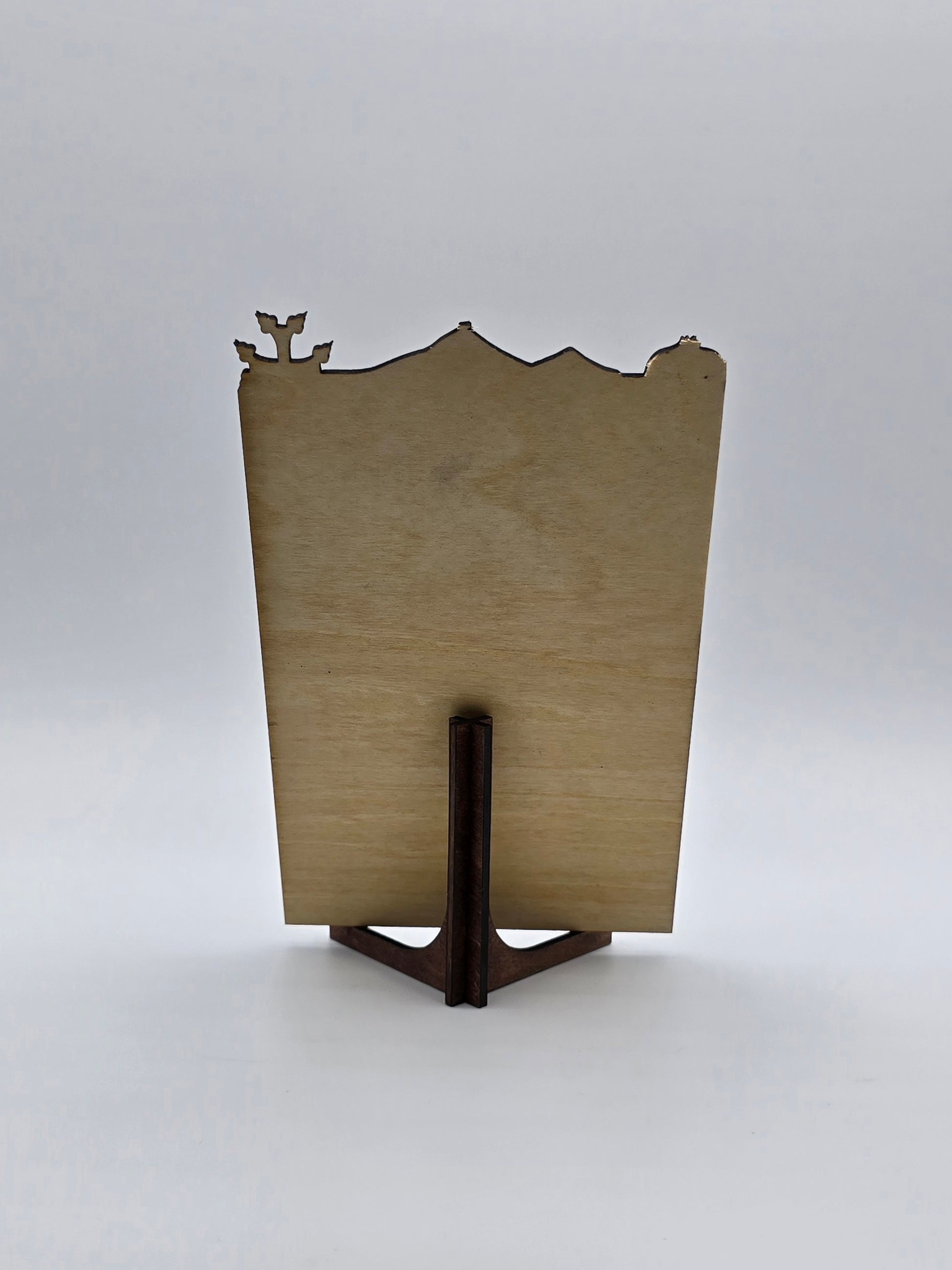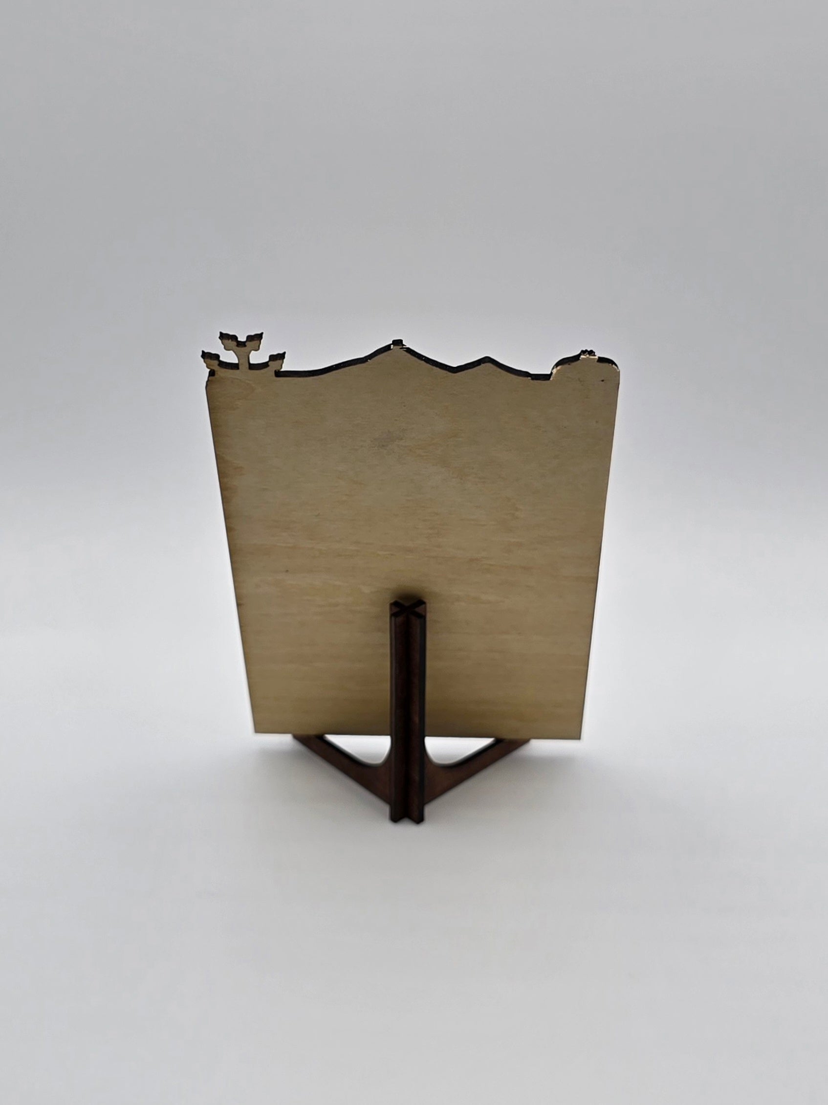 - Comes with a sturdy wooden stand for tabletop or altar display