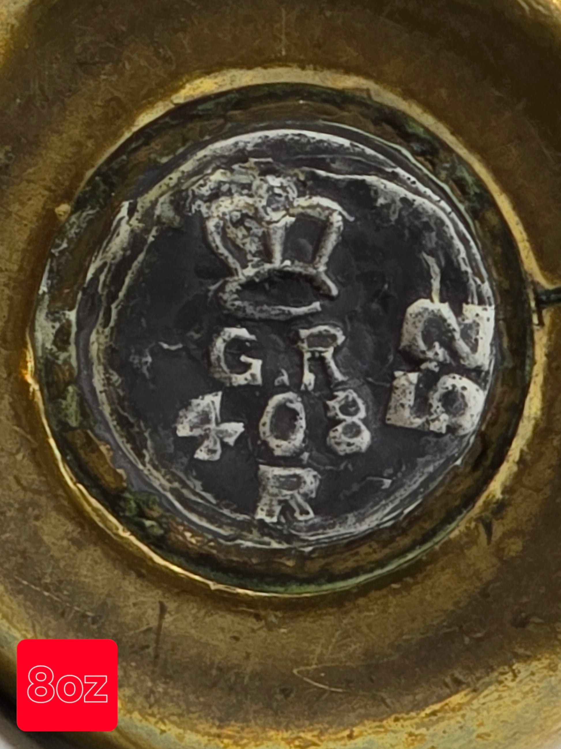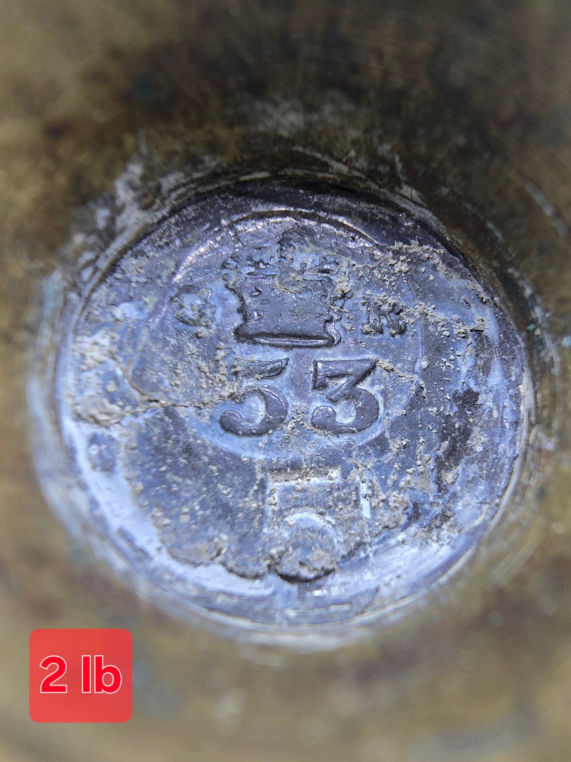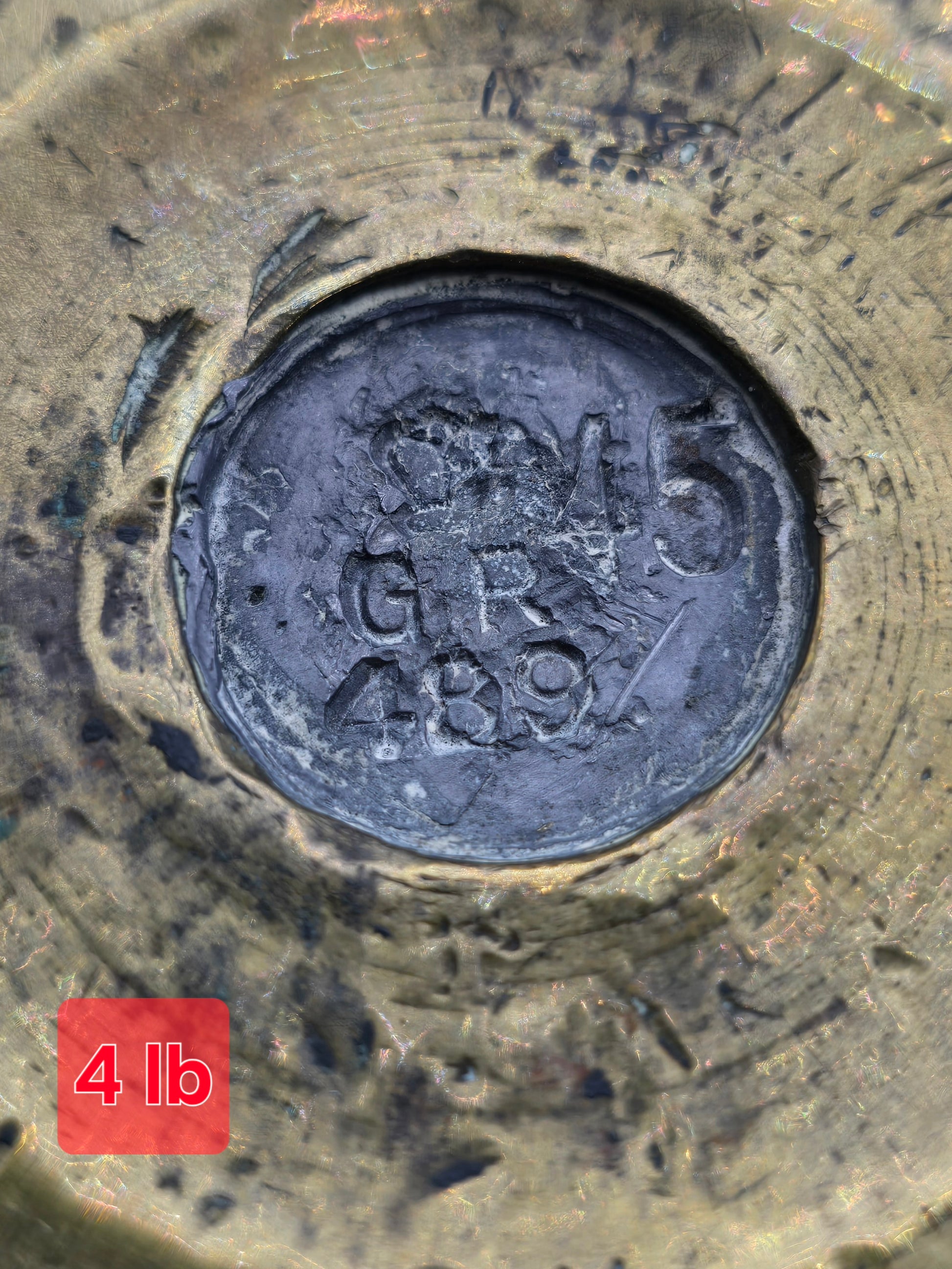 Those brass bell-form weights with the G R mark are likely Imperial British trade weights from the Georgian era, with “G R” standing for Georgius Rex (Latin for King George). That mark was commonly used during the reigns of George III (1760–1820) and George IV (1820–1830).