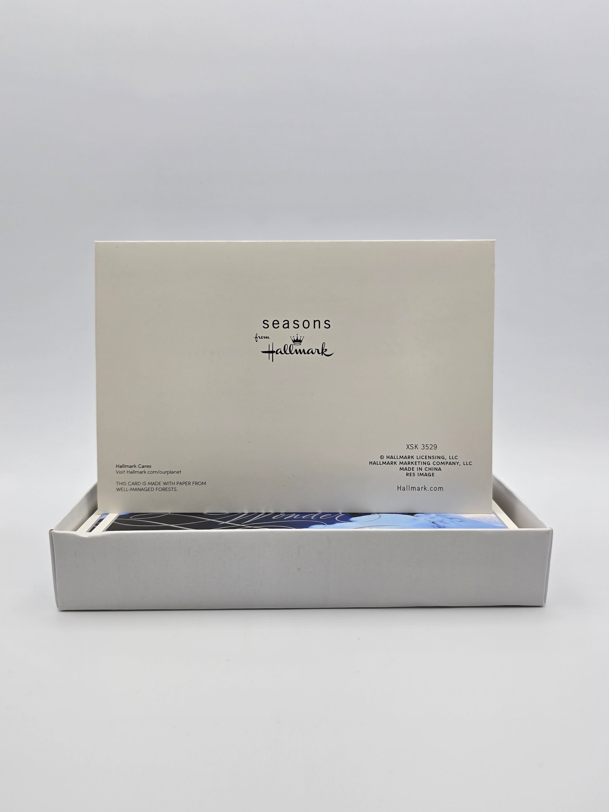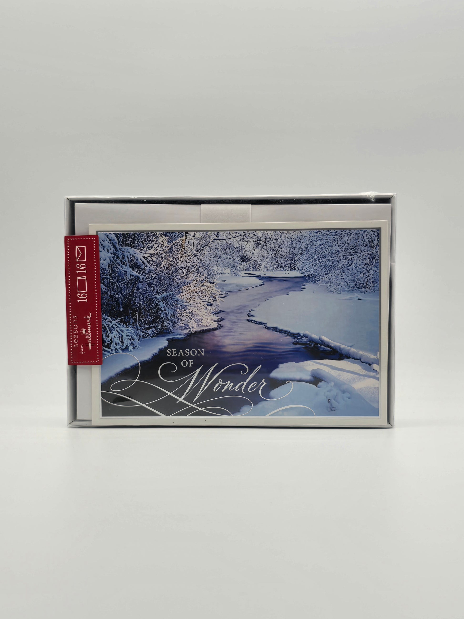 Hallmark Christmas Holiday greeting cards (XSK3529) with the message "Season of Wonder." The card depicts a winter scene with a snow-covered stream and trees. Each card is a testament to the yuletide nostalgia, perfect for collectors.