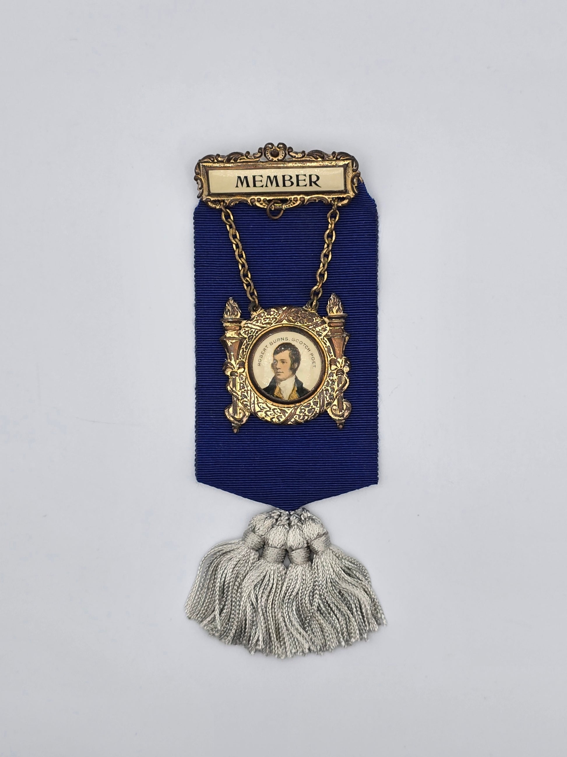 This Vintage Medal is a Membership Badge Honoring Scotch poet Robert Burns, likely issued by a Burns club. These types of medals are typically worn during Burns Night celebrations (January 25th) or other cultural events commemorating Scotland's national poet.