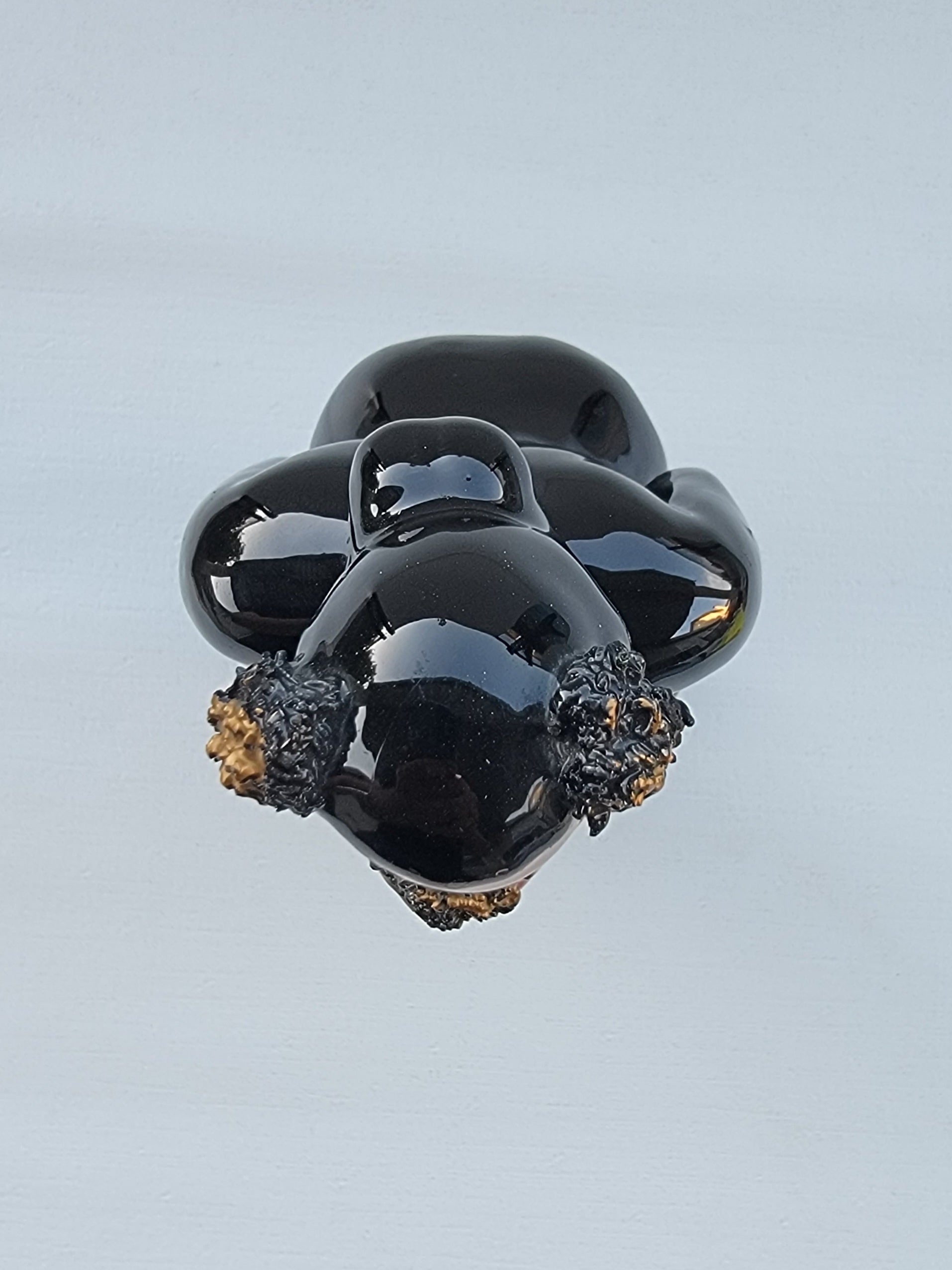 The "spaghetti" is on her hair and on the flowers she is holding. The paint gloss is shiny.