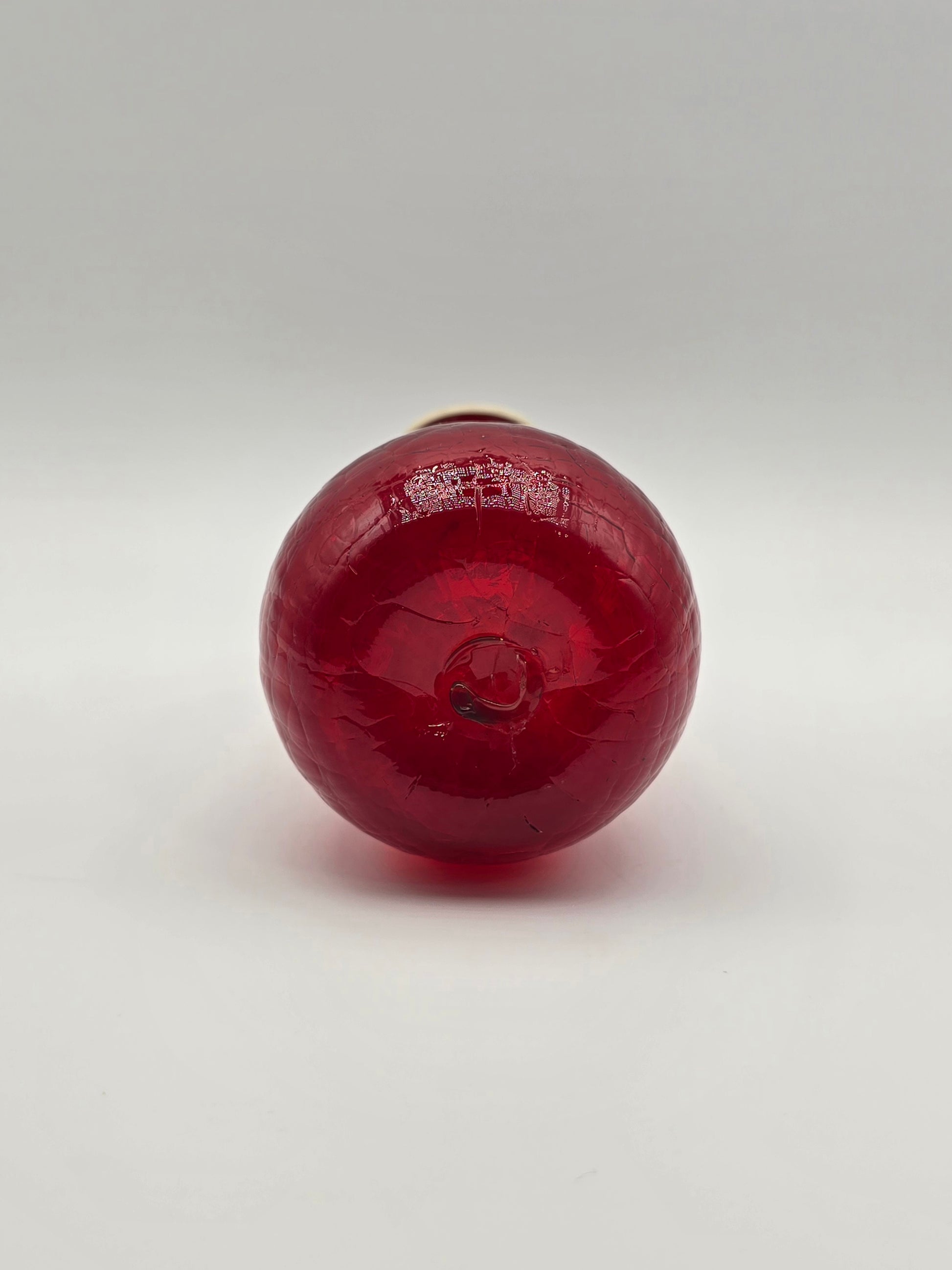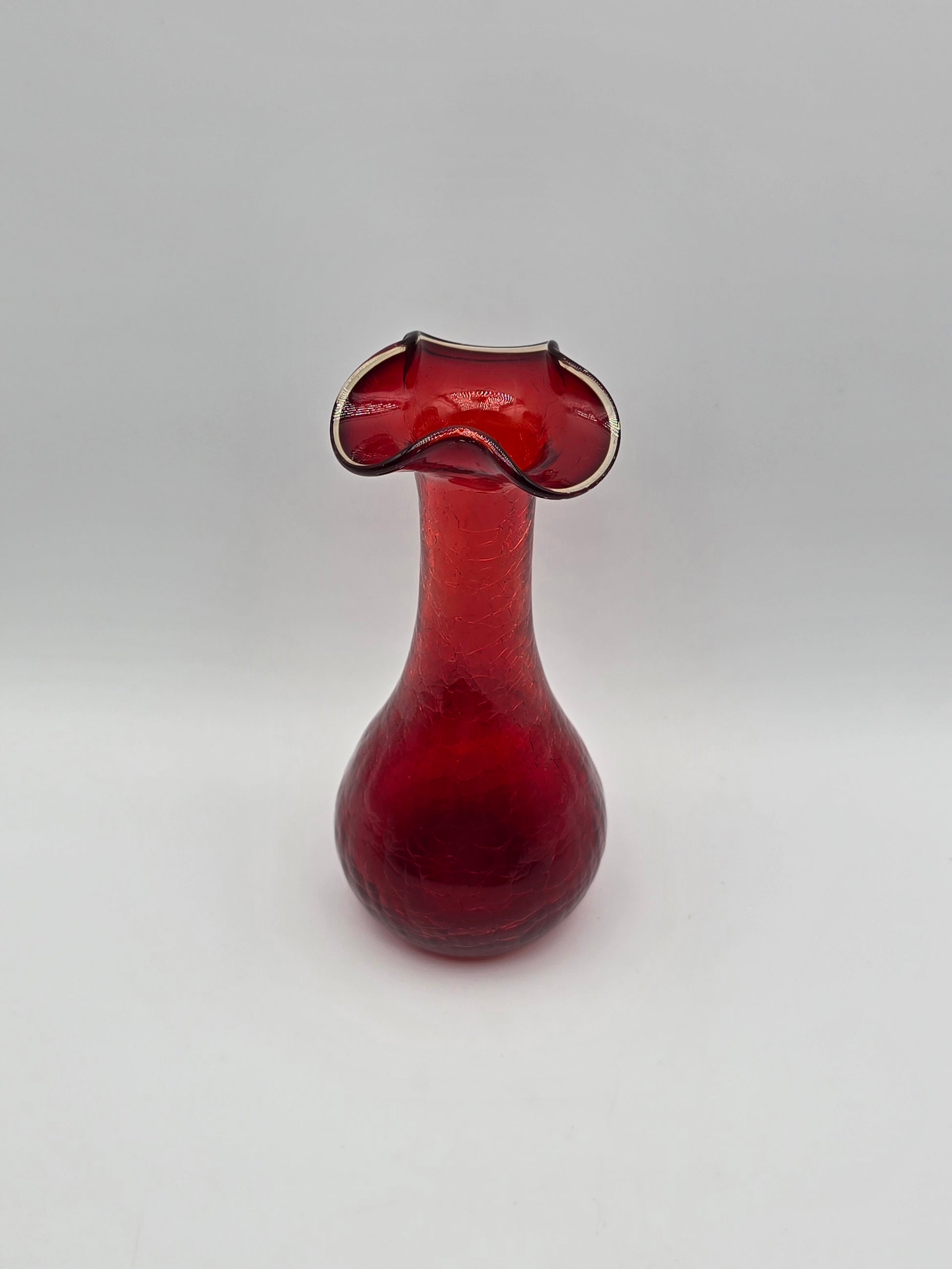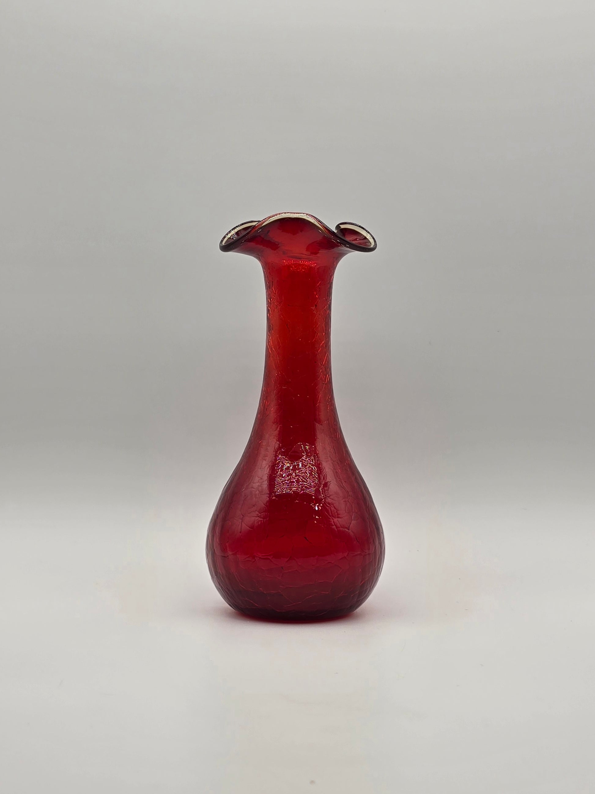 Vintage Ruby Red Rainbow Crackle Glass Vase 7.25” Ruffle Top